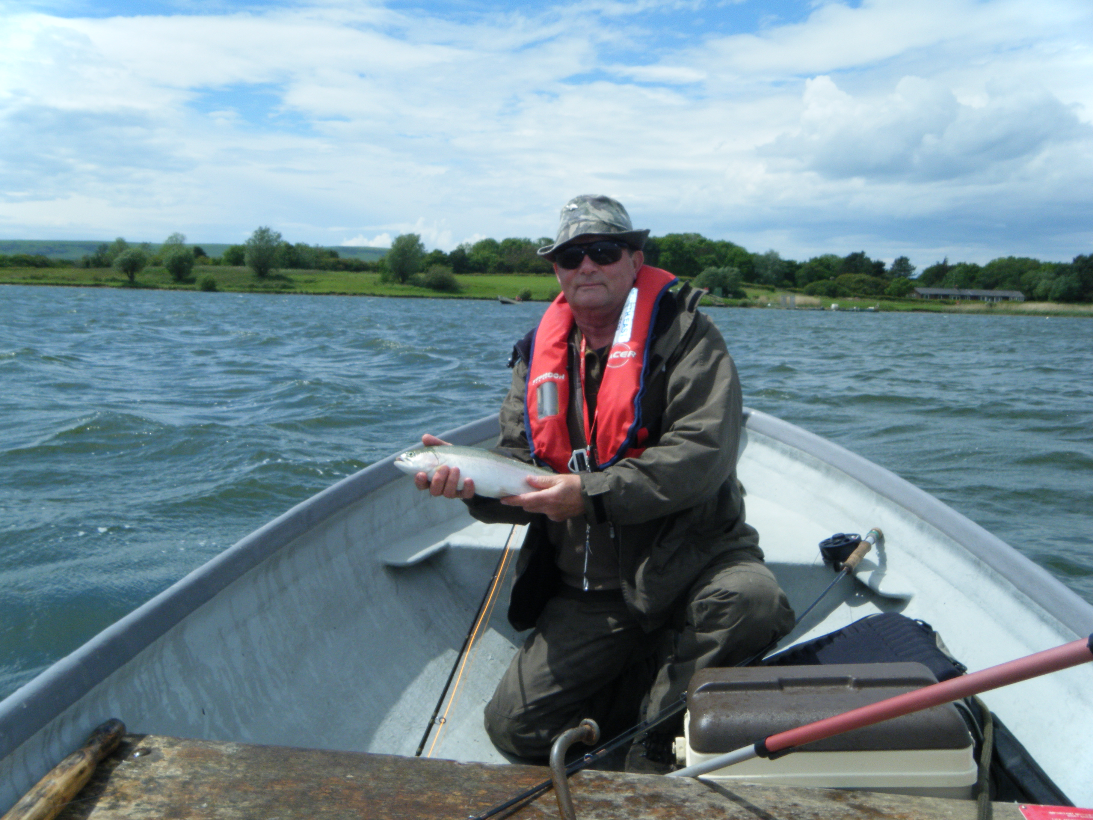Visited Arlington reservoir again yesterday.This time with boat partner and novice Jim Lockhart who is just coming into fly fishing. After a very blustery morning with waves coming over the bow we struggled to connect with fish using teams of buzzer and nymphs patterns. Except for Jim losing his potentially first ever trout as we struggled to get the landing net erected. Lesson to be learned there. After lunch the wind dropped and we ventured out again this time with fast sinking lines and searched the depths with black and green Zonkers. Normally a autumn fly I know but it worked and we bagged 5 trout. Then the weather really calmed for the evening and the fish stopped taking so we changed the Zonkers to white colour which produced another 5 fish. I can’t tell you how many fish we lost to trout just grabbing or playing with the fly’s tail. I shall now be tying a set of flies to try and combat this occurrence by putting the hook in the tail. Here is a photo of Jim and his first trout and the fabulous scenery to take in when the fish aren’t biting.