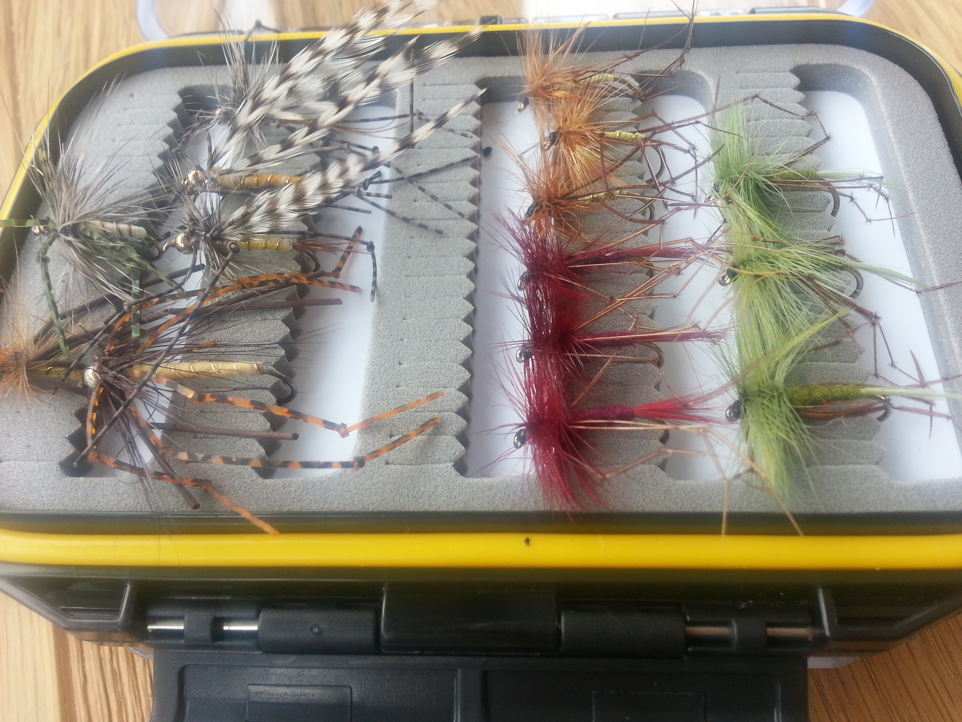 Just started tying and topping up my Daddys as they’ve had a right hammering from the trout this season. They love these flies and it’s hardly surprising. There is nothing more insecty looking than the Crane Fly or Daddy Long Legs. And what a mouth full for the feisty trout. A little fiddly to tie but a great fly to imitate. Works really well fished dry or sinking. If allowed to sink get ready for takes at any time as it falls through the water layers. The natural fly is prolific late summer and Autumn but I like to try them all season. If you type “Crane Fly images” into your search engine there are lots of nice pics to study and copy from. Never go anywhere without your Daddys. Tight Lines Howie