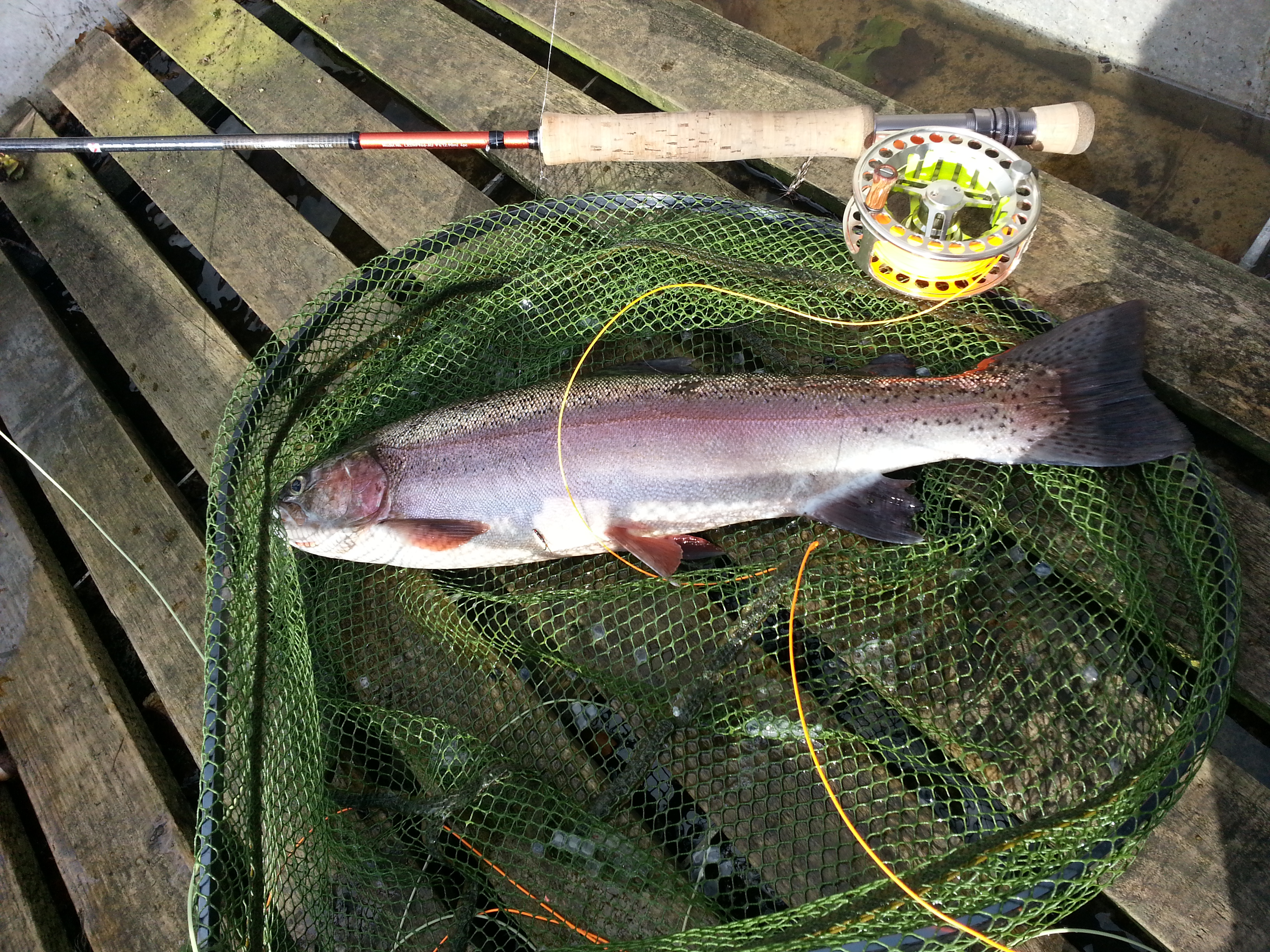 At last, it’s stopped raining. So I go and visit my local lakes to try out the new rod,reel and line. I purchased a very slow sinking line which is great for those flat calm days. You can work the flies just under the surface without causing a wake on the water. The idea paid off as I was rewarded with three nice rainbows one to a daddy on the point and the other two took a diawl bach on the dropper.