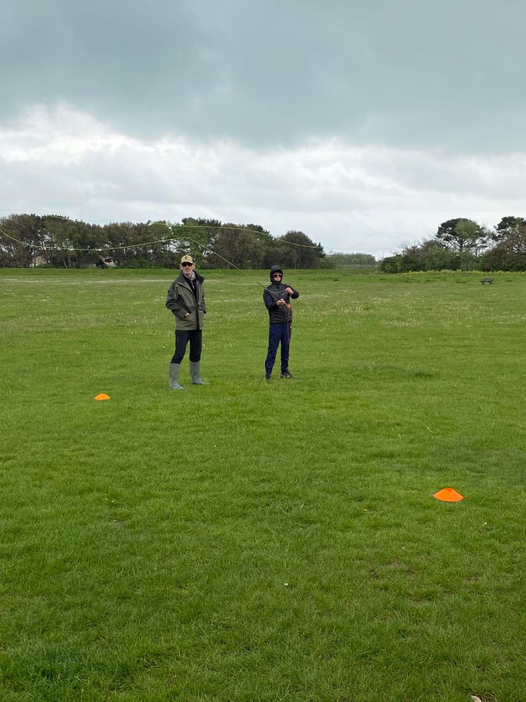 Father and son preparing for their Scottish salmon fishing trip. For a complete beginner those are pretty impressive loops being thrown there