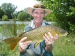 Just a quick note to say thank you for inviting myself and Adam along to go fly fishing for carp with the Sussex Fly Dressers Guild a few weeks back. It has put the spark of excitement back into fishing for me and I have had quite a few ‘carp days’ this summer now and am truly hooked. Especially during those hot summer days when trout fishing gets very difficult and often boring, watching a 10lb carp suck down your fly and then go off like a bullet train is truly amazing. The excitement and adrenaline make me feel like the 12 year old, over-enthusiastic little boy chasing tiddlers at the local park all over again and I am loving it. Just that now it’s not about catching tiddlers but fish that are bigger and much stronger than anything I have ever caught before. The best fish I have caught so far was a 14lb common carp that day at Jenny’s lake, here is the picture for your blog.