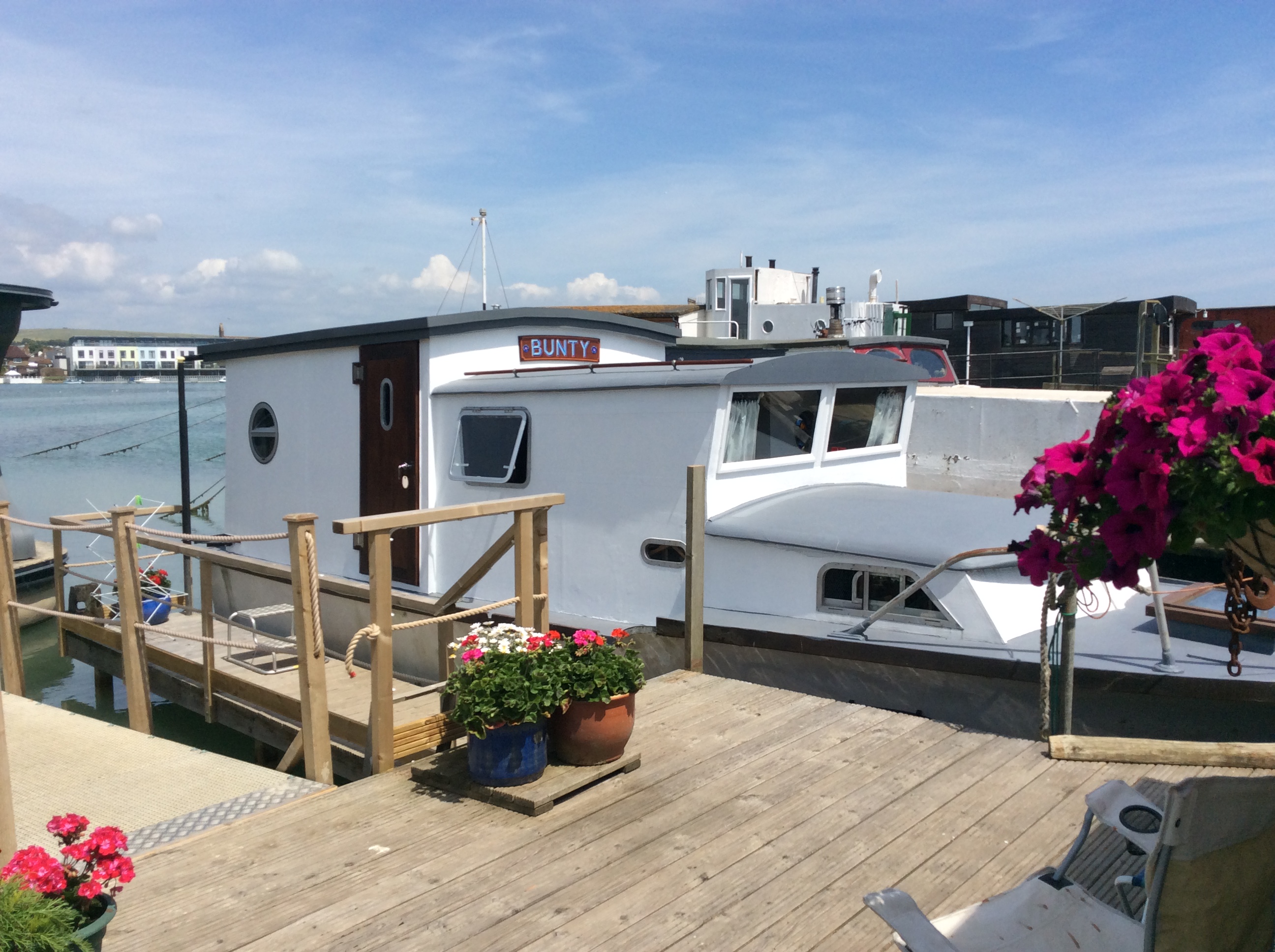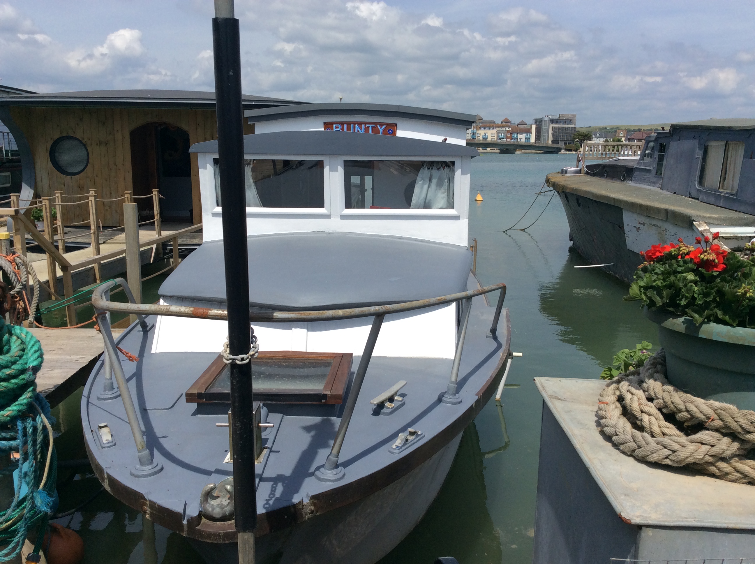 I have lived on a houseboat at The Riverbank for 30 years now. Along with my wife Jo at Shoreham by Sea. It’s a very special place and lovely houseboat community here. Every houseboat is unique and are very popular with site seers to Shoreham by Sea. We also have on our mooring a converted cabin cruiser we named Bunty. It has been saved, restored, and converted into a self-contained mini houseboat accommodation. It is very cute, comfortable and sleeps up to three people. With a large double bed and a single bed settee. Complete with a toilet and shower room (heads) well equipped kitchen (galley) and lounge (saloon) for relaxing. Just sit back with a drink and enjoy the view over the River Adur estuary which is a S.S.S. site and RSBB sanctuary. This is a very popular fishing location for Atlantic bass, 3 species of grey mullet to name a few. No fishing license is required here. Fishing season is from May till November. There is private and free parking on site. Plenty of good pubs and riverside restaurants within walking distance